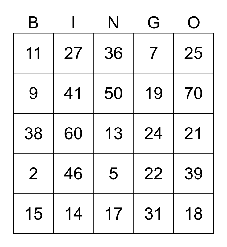 This bingo card has a free space and 54 words: 1, 2, 3, 4, 5, 6, 7, 8, 9, 10, 11, 12, 14, 15, 16, 17, 18, 19, 20, 21, 22, 23, 24, 25, 26, 27, 28, 29, 30, 31, 32, 33, 34, 35, 36, 37, 38, 39, 40, 41, 42, 43, 44, 45, 46, 47, 48, 49, 50, 60, 70, 80, 90 and 100.