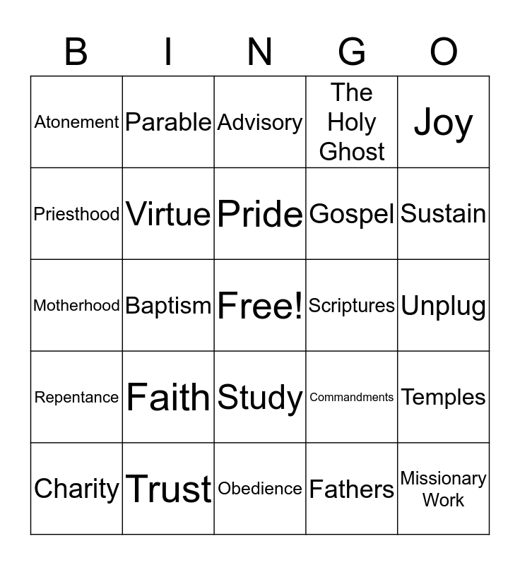 This bingo card has a free space and 24 words: Faith, Trust, Pride, Charity, Joy, Atonement, Priesthood, Parable, Scriptures, Study, Gospel, Motherhood, Commandments, Temples, Virtue, Fathers, Unplug, Advisory, Sustain, Baptism, Missionary Work, Repentance, The Holy Ghost and Obedience.