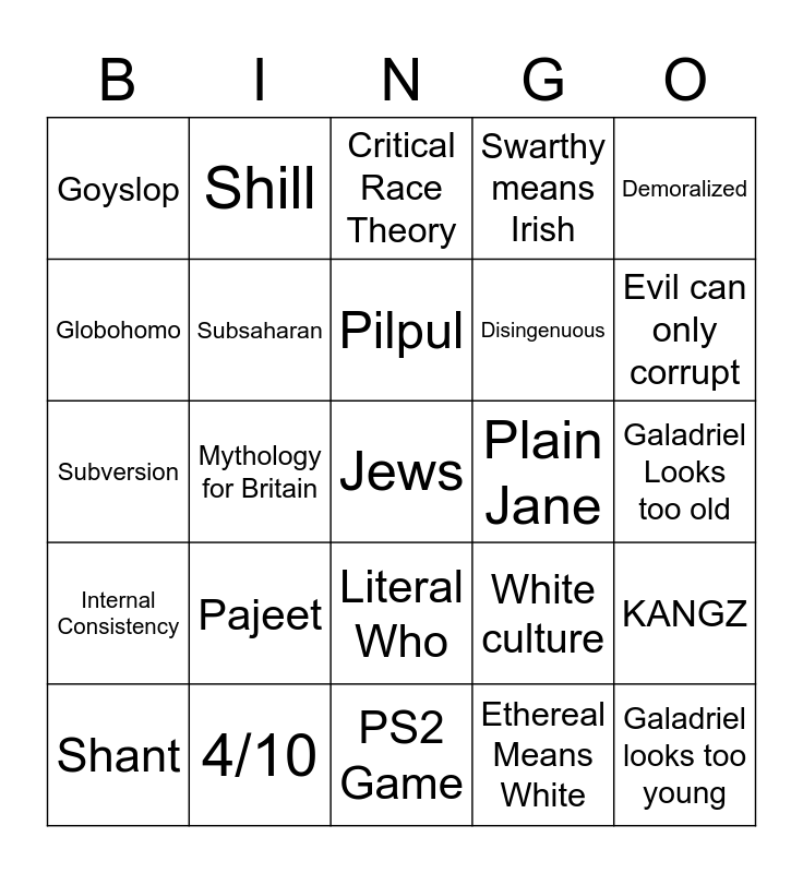 This bingo card has a free space and 24 words: Pajeet, 4/10, Pilpul, Shant, Demoralized, Goyslop, Globohomo, Shill, Plain Jane, Literal Who, Disingenuous, Subversion, White culture, KANGZ, Subsaharan, Ethereal Means White, Galadriel Looks too old, Critical Race Theory, Evil can only corrupt, Mythology for Britain, Galadriel looks too young, Internal Consistency, Swarthy means Irish and PS2 Game.