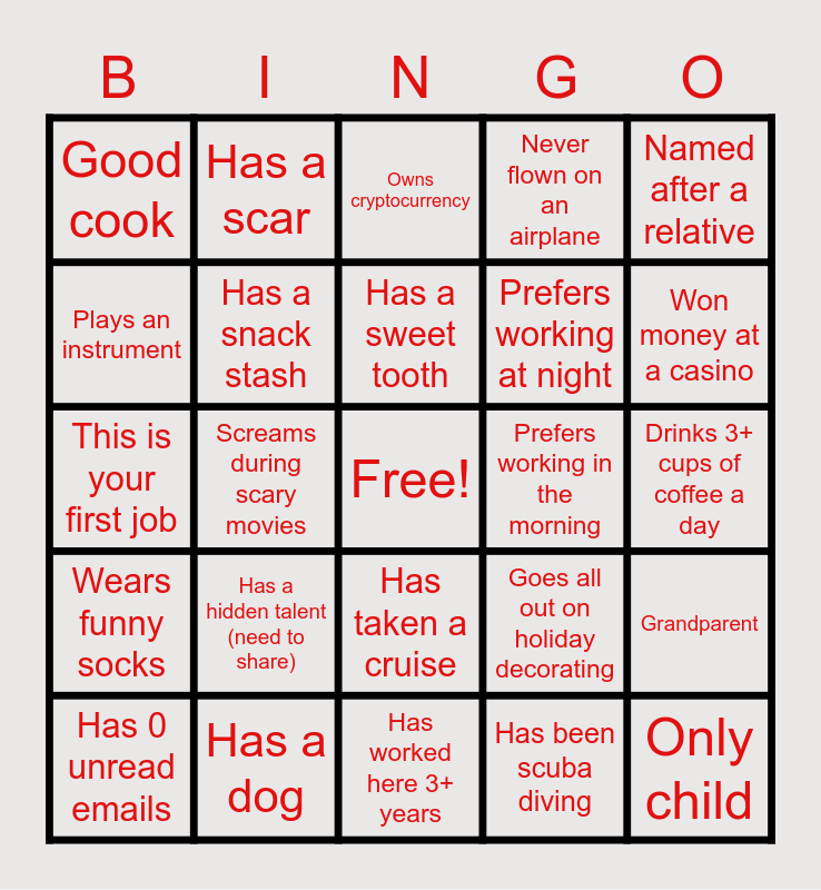 This bingo card has a free space and 39 words: Loves True Crime Shows, Has a tattoo, Knows the whole periodic table, Has a snack stash, Has 0 unread emails, Has taken a cruise, Has a sweet tooth, Has a messy desk, Named after a relative, Wears funny socks, Screams during scary movies, Never flown on an airplane, Only child, Drinks 3+ cups of coffee a day, Prefers working in the morning, Has a hidden talent (need to share), Loves roller coasters, Good cook, Played prank on a co-worker (need to share), Goes all out on holiday decorating, Plays an instrument, Has worked here 3+ years, Prefers working at night, Won money at a casino, Likes pineapple on pizza, Collects something (need to share), Lived in another country, Has a cat, Does Yoga, Has a scar, Can bake a cake from scratch, Parent, Owns cryptocurrency, Has a dog, Has been scuba diving, Can hula hoop, Grandparent, This is your first job and Has a bucket list.