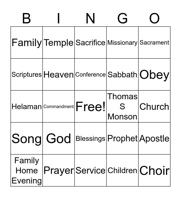 This bingo card has a free space and 24 words: God, Prayer, Conference, Family Home Evening, Sacrament, Family, Scriptures, Temple, Thomas S Monson, Blessings, Sabbath, Helaman, Prophet, Apostle, Heaven, Children, Church, Sacrifice, Obey, Commandment, Choir, Song, Missionary and Service.