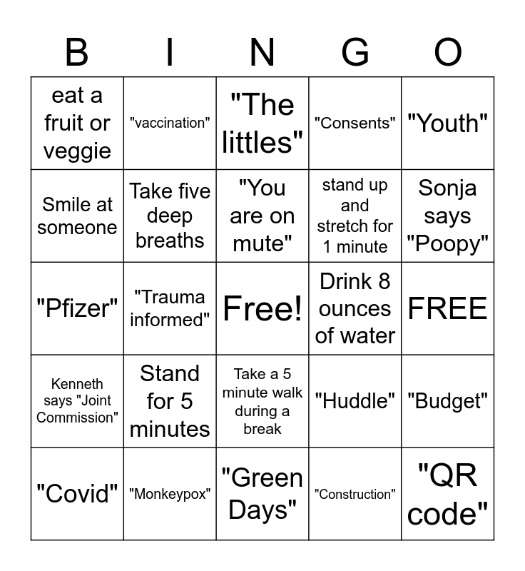 This bingo card has a free space and 25 words: Stand for 5 minutes, "Green Days", "You are on mute", "Covid", "Youth", eat a fruit or veggie, Smile at someone, "vaccination", Drink 8 ounces of water, Take a 5 minute walk during a break, stand up and stretch for 1 minute, "Pfizer", "Huddle", "Budget", Take five deep breaths, "Moderna", FREE, "The littles", Sonja says "Poopy", "Trauma informed", "QR code", "Monkeypox", Kenneth says "Joint Commission", "Consents" and "Construction".