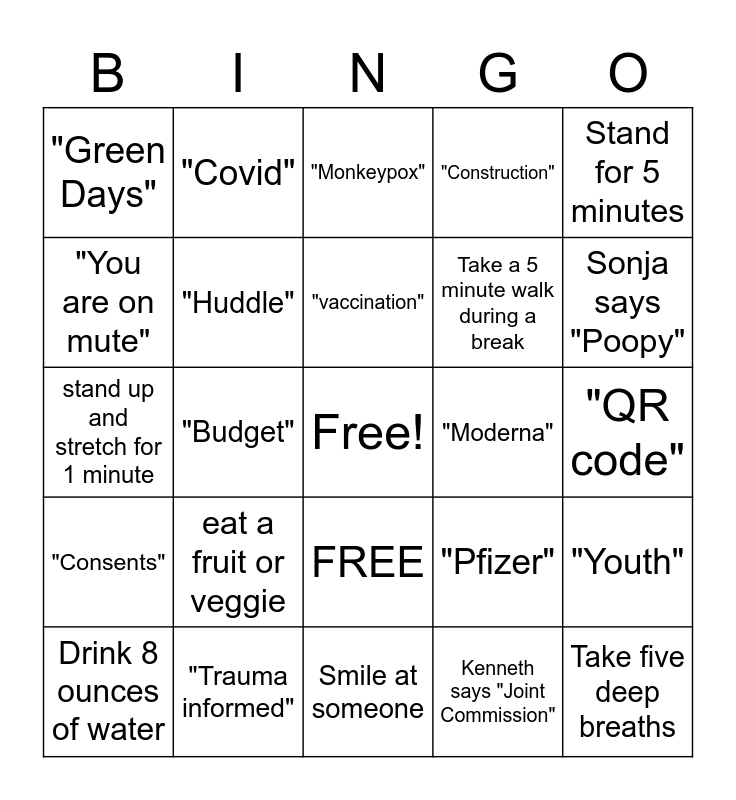 This bingo card has a free space and 25 words: eat a fruit or veggie, Smile at someone, "vaccination", Drink 8 ounces of water, Stand for 5 minutes, "Green Days", "You are on mute", "Covid", "Moderna", FREE, Take a 5 minute walk during a break, stand up and stretch for 1 minute, "Pfizer", "Youth", "Huddle", "The littles", "QR code", "Monkeypox", Sonja says "Poopy", "Budget", Take five deep breaths, "Trauma informed", "Consents", "Construction" and Kenneth says "Joint Commission".