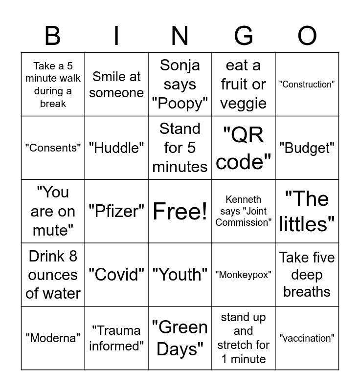 This bingo card has a free space and 24 words: "Covid", "Trauma informed", Stand for 5 minutes, "Moderna", "Construction", Take a 5 minute walk during a break, "Consents", Smile at someone, Kenneth says "Joint Commission", "Youth", "QR code", "You are on mute", "Monkeypox", Take five deep breaths, "Huddle", stand up and stretch for 1 minute, "The littles", Sonja says "Poopy", "Budget", "Pfizer", "vaccination", Drink 8 ounces of water, eat a fruit or veggie and "Green Days".