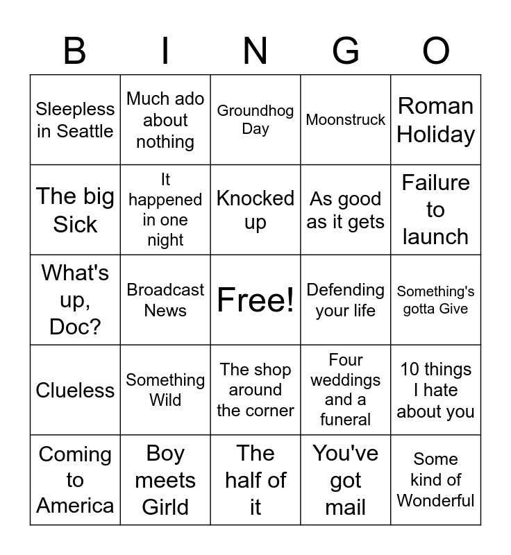 This bingo card has a free space and 24 words: Something Wild, Boy meets Girld, Knocked up, Coming to America, Roman Holiday, Sleepless in Seattle, The big Sick, Much ado about nothing, Defending your life, The shop around the corner, As good as it gets, What's up, Doc?, Four weddings and a funeral, 10 things I hate about you, It happened in one night, You've got mail, Something's gotta Give, Groundhog Day, Failure to launch, Broadcast News, Some kind of Wonderful, Clueless, Moonstruck and The half of it.