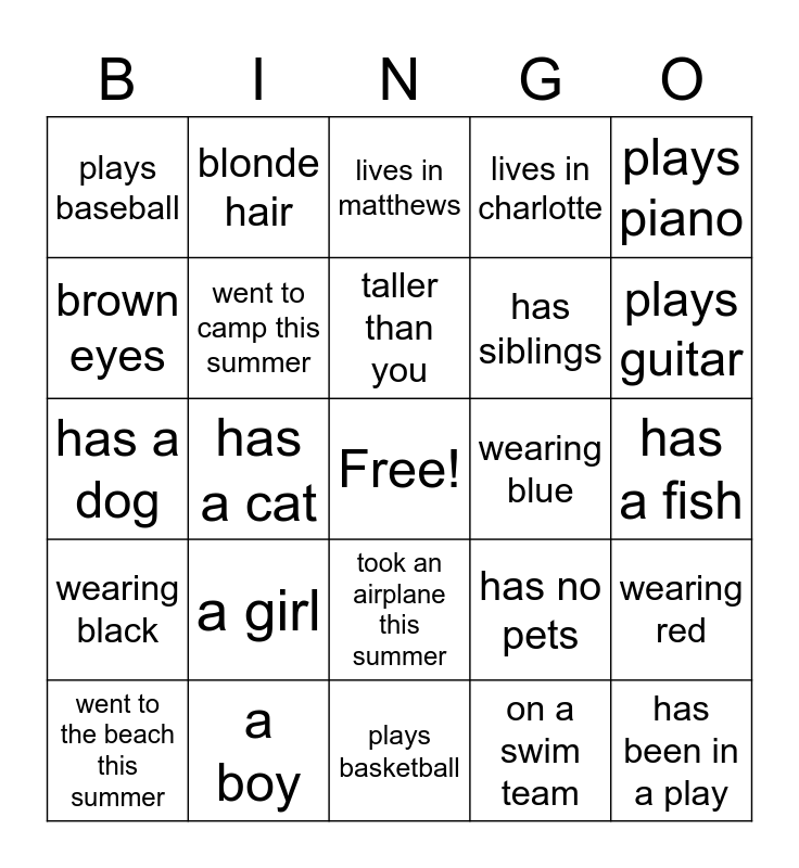 This bingo card has a free space and 24 words: a girl, a boy, taller than you, went to the beach this summer, plays piano, plays baseball, brown eyes, blonde hair, wearing blue, took an airplane this summer, has siblings, has a dog, has no pets, wearing red, went to camp this summer, on a swim team, has a fish, lives in matthews, plays guitar, has a cat, has been in a play, wearing black, lives in charlotte and plays basketball.