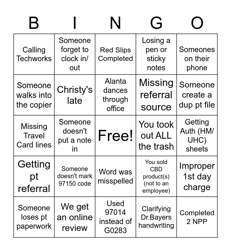 This bingo card has a free space and 24 words: Someone loses pt paperwork, Someone doesn't mark 97150 code, Alanta dances through office, Clarifying Dr.Bayers handwriting, Someones on their phone, Calling Techworks, Someone forget to clock in/ out, Red Slips Completed, You took out ALL the trash, Getting Auth (HM/ UHC) sheets, Missing Travel Card lines, Christy's late, You sold CBD product(s) (not to an employee), Improper 1st day charge, Someone walks into the copier, We get an online review, Used 97014 instead of G0283, Losing a pen or sticky notes, Someone create a dup pt file, Getting pt referral, Someone doesn't put a note in, Word was misspelled, Missing referral source and Completed 2 NPP.