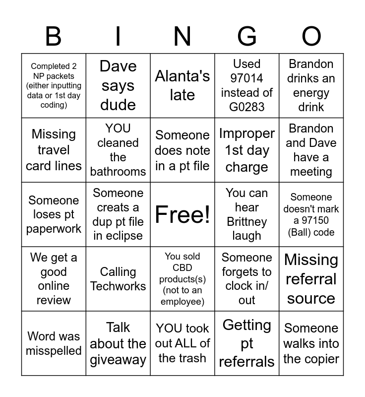 This bingo card has a free space and 24 words: Calling Techworks, Talk about the giveaway, Someone does note in a pt file, Word was misspelled, Brandon drinks an energy drink, Completed 2 NP packets (either inputting data or 1st day coding), Missing travel card lines, Dave says dude, You can hear Brittney laugh, You sold CBD products(s) (not to an employee), Improper 1st day charge, Someone loses pt paperwork, Someone forgets to clock in/ out, Missing referral source, YOU cleaned the bathrooms, Getting pt referrals, Someone doesn't mark a 97150 (Ball) code, Alanta's late, Brandon and Dave have a meeting, Someone creats a dup pt file in eclipse, Someone walks into the copier, We get a good online review, Used 97014 instead of G0283 and YOU took out ALL of the trash.