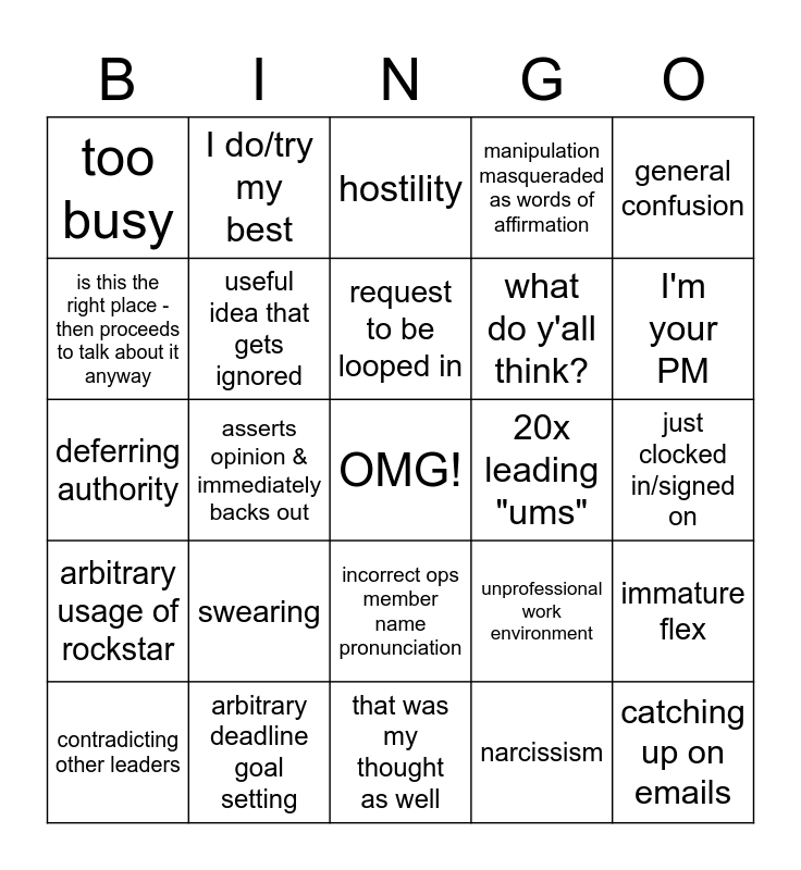 This bingo card has a free space and 29 words: complaint about sth they themselves are unclear on, arbitrary deadline goal setting, hostility, "I have nothing for the group", general confusion, too busy, useful idea that gets ignored, request to be looped in, 20x leading "ums", immature flex, contradicting other leaders, asserts opinion & immediately backs out, narcissism, catching up on emails, deferring authority, gossip, that was my thought as well, unprofessional work environment, I'm your PM, arbitrary usage of rockstar, swearing, piggyback /tag-on, what do y'all think?, just clocked in/signed on, is this the right place - then proceeds to talk about it anyway, I do/try my best, incorrect ops member name pronunciation, manipulation masqueraded as words of affirmation and improper request for training as solutions.