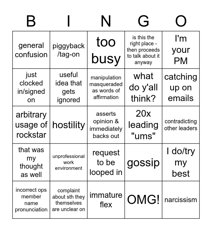 This bingo card has 30 words: complaint about sth they themselves are unclear on, arbitrary deadline goal setting, hostility, "I have nothing for the group", general confusion, too busy, useful idea that gets ignored, request to be looped in, 20x leading "ums", immature flex, contradicting other leaders, asserts opinion & immediately backs out, OMG!, narcissism, catching up on emails, deferring authority, gossip, that was my thought as well, unprofessional work environment, I'm your PM, arbitrary usage of rockstar, swearing, piggyback /tag-on, what do y'all think?, just clocked in/signed on, is this the right place - then proceeds to talk about it anyway, I do/try my best, incorrect ops member name pronunciation, manipulation masqueraded as words of affirmation and improper request for training as solutions.