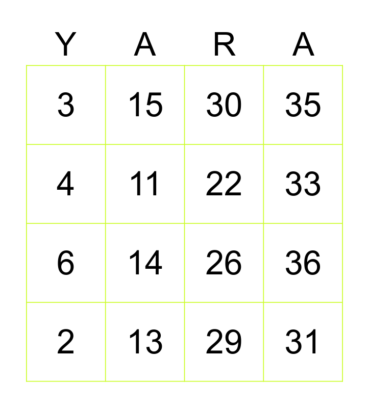 This bingo card has 40 words: 1, 11, 21, 31, 2, 12, 22, 32, 3, 13, 23, 33, 4, 14, 24, 34, 5, 15, 25, 35, 6, 16, 26, 36, 7, 17, 27, 37, 8, 18, 28, 38, 9, 19, 29, 39, 10, 20, 30 and 40.