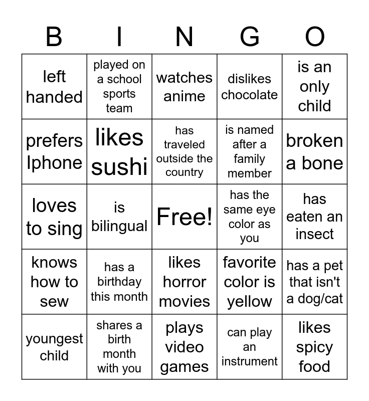 This bingo card has a free space and 24 words: youngest child, has a birthday this month, has traveled outside the country, can play an instrument, is an only child, left handed, played on a school sports team, watches anime, has the same eye color as you, has eaten an insect, loves to sing, likes sushi, favorite color is yellow, has a pet that isn't a dog/cat, prefers Iphone, shares a birth month with you, plays video games, dislikes chocolate, broken a bone, knows how to sew, is bilingual, likes horror movies, is named after a family member and likes spicy food.