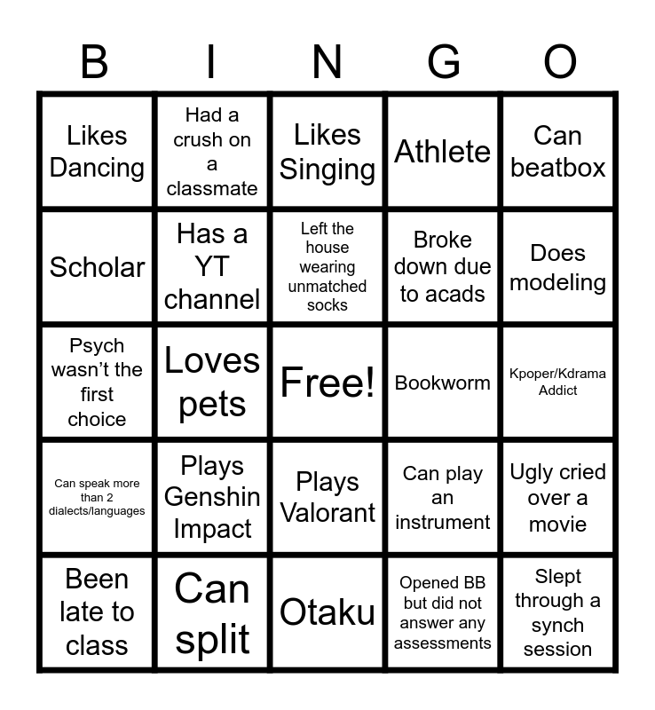 This bingo card has a free space and 30 words: Can split, Can cartwheel, Loves pets, Plantito/Plantita, Likes Dancing, Likes Singing, Has a YT channel, Plays Valorant, Bookworm, Otaku, Kpoper/Kdrama Addict, Slept through a synch session, Opened BB but did not answer any assessments, Lied that the cam/mic isn’t working during a synch class, Does modeling, Joined a pageant, Can play an instrument, Can speak more than 2 dialects/languages, Plays Genshin Impact, Can beatbox, Psych wasn’t the first choice, Filmed a tiktok but didn’t post it, Had a crush on a classmate, Broke down due to acads, Scholar, Athlete, Ugly cried over a movie, Been late to class, Left the house wearing unmatched socks and Online Shopping addict.