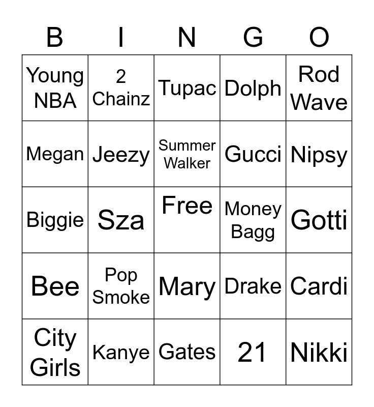 This bingo card has a free space and 27 words: Drake, T Taylor, Gucci, Gates, Megan, Tupac, 2 Chainz, Bee, Money Bagg, Cardi, Biggie, Dolph, City Girls, Kanye, Nipsy, Lil kim, Jeezy, Summer Walker, Pop Smoke, Young NBA, Gotti, 21, Sza, Nikki, Mary, Rod Wave and Weezy.