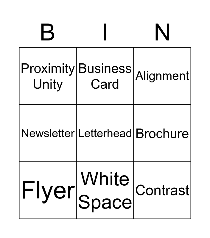 This bingo card has 9 words: Flyer, Alignment, Business Card, Newsletter, Proximity Unity, Brochure, Letterhead, Contrast and White Space.