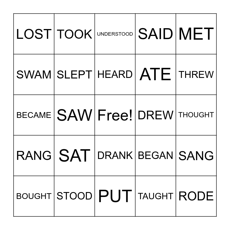 This bingo card has a free space and 24 words: SAT, STOOD, HEARD, BOUGHT, MET, LOST, SWAM, TOOK, DREW, DRANK, ATE, BECAME, BEGAN, SANG, SLEPT, TAUGHT, THOUGHT, UNDERSTOOD, THREW, SAW, RODE, RANG, SAID and PUT.