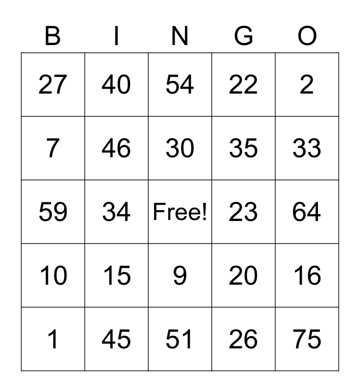 This bingo card has a free space and 24 words: 15, 45, 30, 1, 2, 27, 7, 40, 23, 9, 35, 59, 20, 16, 46, 26, 64, 54, 33, 34, 75, 10, 22 and 51.