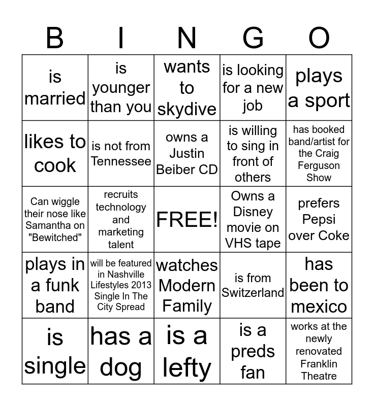 This bingo card has a free space and 24 words: will be featured in Nashville Lifestyles 2013 Single In The City Spread, has a dog, owns a Justin Beiber CD, is single, plays a sport, is married, likes to cook, is younger than you, Owns a Disney movie on VHS tape, watches Modern Family, is willing to sing in front of others, Can wiggle their nose like Samantha on "Bewitched", is from Switzerland, has been to mexico, is not from Tennessee, is a preds fan, prefers Pepsi over Coke, wants to skydive, has booked band/artist for the Craig Ferguson Show, recruits technology and marketing talent, works at the newly renovated Franklin Theatre, plays in a funk band, is looking for a new job and is a lefty.
