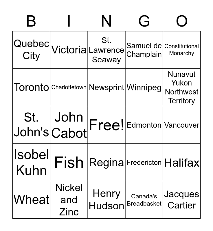 This bingo card has a free space and 24 words: Fish, Nickel and Zinc, Newsprint, Wheat, Constitutional Monarchy, Quebec City, Toronto, Victoria, Edmonton, Regina, Winnipeg, St. John's, Fredericton, Halifax, Charlottetown, Canada's Breadbasket, Vancouver, St. Lawrence Seaway, Nunavut Yukon Northwest Territory, John Cabot, Jacques Cartier, Isobel Kuhn, Samuel de Champlain and Henry Hudson.