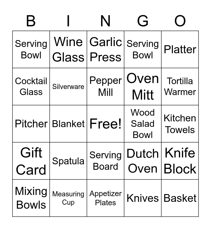 This bingo card has a free space and 24 words: Spatula, Measuring Cup, Pepper Mill, Mixing Bowls, Platter, Serving Bowl, Cocktail Glass, Wine Glass, Wood Salad Bowl, Serving Board, Oven Mitt, Pitcher, Dutch Oven, Knife Block, Silverware, Knives, Kitchen Towels, Garlic Press, Tortilla Warmer, Blanket, Basket, Gift Card, Serving Bowl and Appetizer Plates.