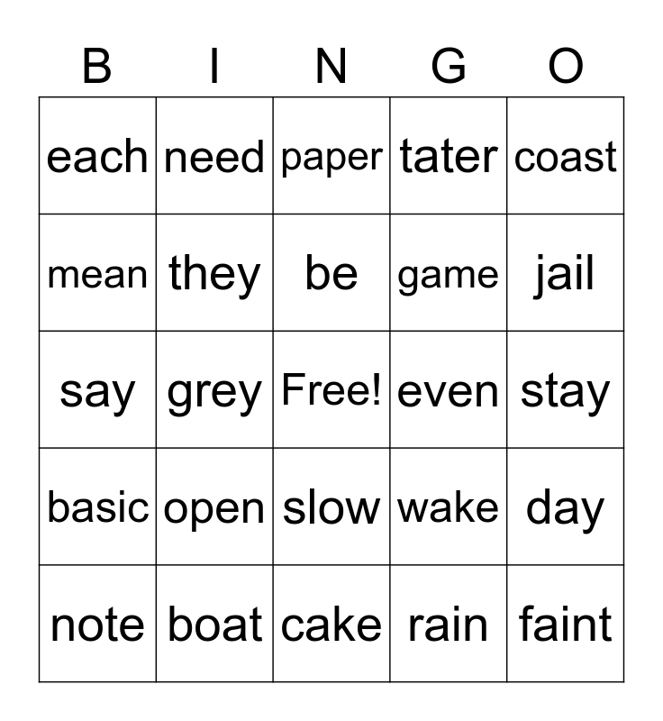 This bingo card has a free space and 24 words: open, boat, be, note, coast, each, mean, need, even, slow, game, say, wake, day, they, rain, stay, paper, jail, grey, faint, basic, tater and cake.