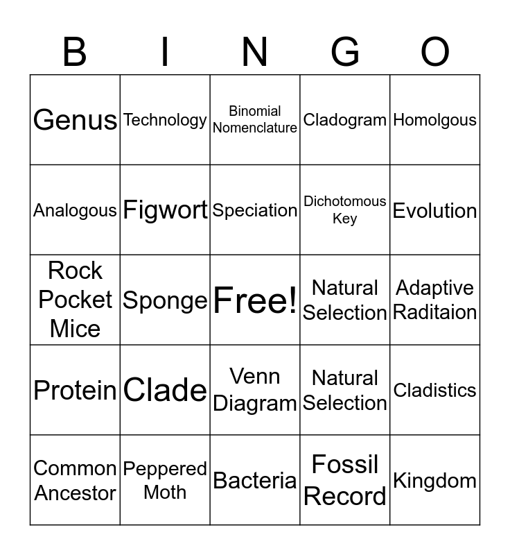 This bingo card has a free space and 24 words: Clade, Peppered Moth, Speciation, Common Ancestor, Homolgous, Genus, Analogous, Technology, Natural Selection, Venn Diagram, Dichotomous Key, Rock Pocket Mice, Natural Selection, Cladistics, Figwort, Fossil Record, Adaptive Raditaion, Binomial Nomenclature, Evolution, Sponge, Kingdom, Protein, Cladogram and Bacteria.