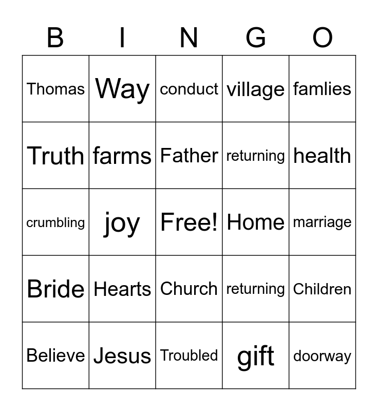 This bingo card has a free space and 25 words: Hearts, Troubled, Father, Believe, famlies, Thomas, Truth, Way, Home, Church, returning, crumbling, returning, Children, farms, oikos, marriage, conduct, health, joy, doorway, Jesus, Bride, village and gift.