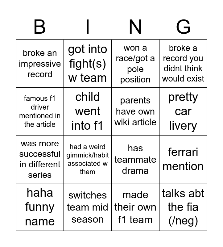 This bingo card has 16 words: switches team mid season, ferrari mention, won a race/got a pole position, broke an impressive record, was more successful in different series, got into fight(s) w team, has teammate drama, made their own f1 team, famous f1 driver mentioned in the article, child went into f1, haha funny name, broke a record you didnt think would exist, had a weird gimmick/habit associated w them, pretty car livery, parents have own wiki article and talks abt the fia (/neg).