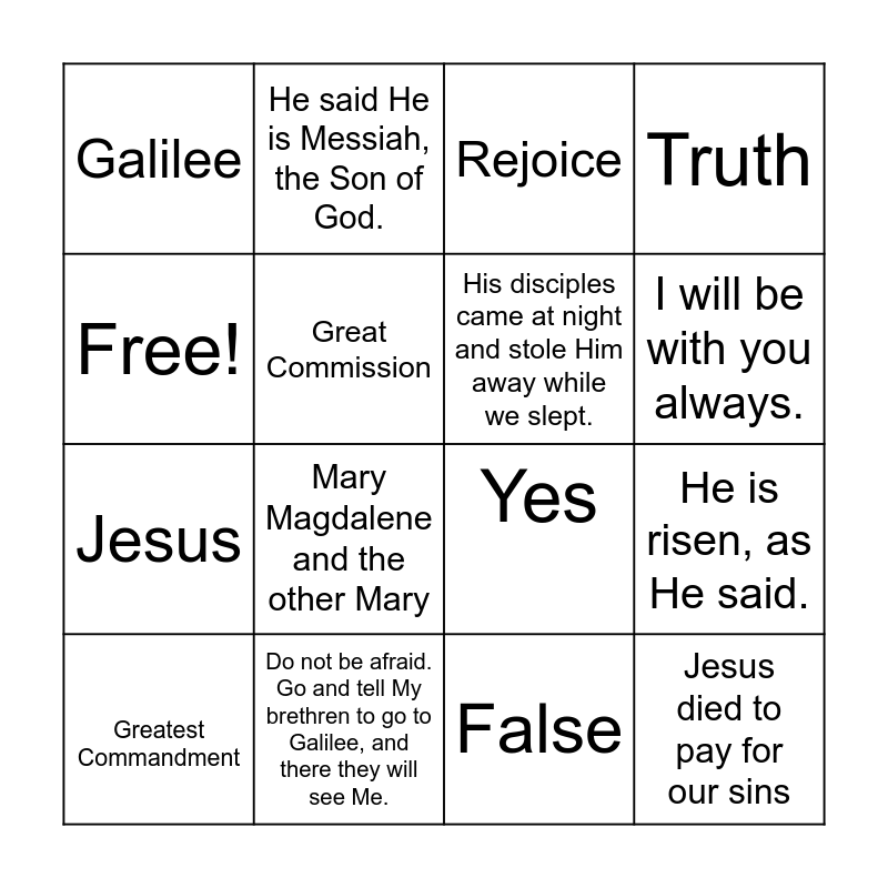 This bingo card has 16 words: Do not be afraid. Go and tell My brethren to go to Galilee, and there they will see Me., He is risen, as He said., Rejoice, Galilee, Jesus, He said He is Messiah, the Son of God., Yes, False, Free!, Great Commission, Greatest Commandment, Truth, Mary Magdalene and the other Mary, I will be with you always., His disciples came at night and stole Him away while we slept. and Jesus died to pay for our sins.
