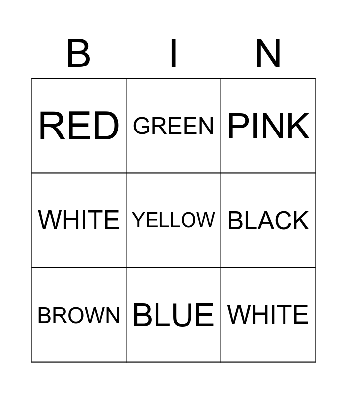 This bingo card has a free space and 11 words: ORANGE, BLUE, WHITE, BROWN, GREEN, PINK, BLACK, GRAY, WHITE, RED and PURPLE.