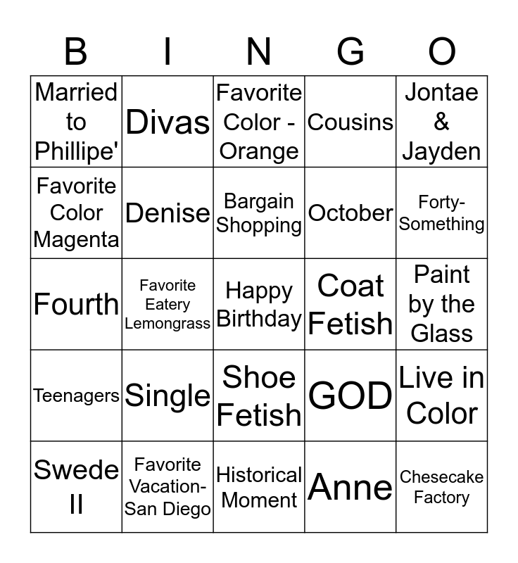 This bingo card has a free space and 24 words: Single, Favorite Vacation-San Diego, Bargain Shopping, Swede II, Jontae & Jayden, Married to Phillipe', Favorite Color Magenta, Divas, Coat Fetish, Shoe Fetish, October, Fourth, GOD, Live in Color, Denise, Anne, Paint by the Glass, Favorite Color - Orange, Forty-Something, Favorite Eatery Lemongrass, Chesecake Factory, Teenagers, Cousins and Historical Moment.
