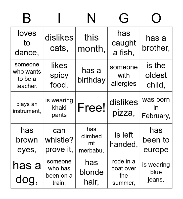 This bingo card has a free space and 34 words: dislikes tomatoes,, rode in a boat over the summer,, rode in a tesla over the summer,, is wearing red,, has brown eyes,, likes spicy food,, has a brother,, has a dog,, dislikes cats,, has a sister,, has a birthday, this month,, wears glasses,, likes to draw,, dislikes pizza,, is the oldest child,, someone who has been on a train,, plays an instrument,, can whistle? prove it,, is left handed,, has climbed mt merbabu,, has ridden a horse,, loves to dance,, was born in February,, has blonde hair,, is wearing blue jeans,, has caught a fish,, read a book over the summer,, someone with allergies, someone who wants to be a teacher., been to china, not just the airport, is wearing khaki pants, has been to europe and has been to africa.