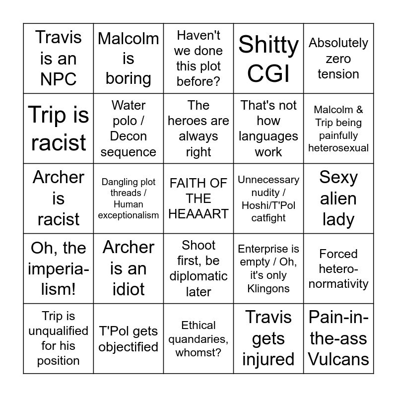 This bingo card has a free space and 24 words: Archer is an idiot, T'Pol gets objectified, The heroes are always right, Trip is unqualified for his position, Absolutely zero tension, Travis is an NPC, Trip is racist, Malcolm is boring, Unnecessary nudity / Hoshi/T'Pol catfight, Shoot first, be diplomatic later, That's not how languages work, Archer is racist, Enterprise is empty / Oh, it's only Klingons, Forced hetero-normativity, Water polo / Decon sequence, Travis gets injured, Sexy alien lady, Haven't we done this plot before?, Malcolm & Trip being painfully heterosexual, Dangling plot threads / Human exceptionalism, Pain-in-the-ass Vulcans, Oh, the imperia-lism!, Shitty CGI and Ethical quandaries, whomst?.