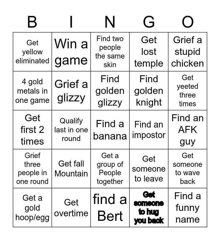 This bingo card has a free space and 24 words: Get fall Mountain, Get overtime, Find golden glizzy, Get a gold hoop/egg, Grief a stupid chicken, Get yellow eliminated, 4 gold metals in one game, Win a game, Find an impostor, Get a group of People together, Find golden knight, Get first 2 times, Get someone to leave, Get someone to wave back, Grief a glizzy, Get someone to hug you back, Find an AFK guy, Find two people the same skin, Get yeeted three times, Qualify last in one round, Find a funny name, Grief three people in one round, Get lost temple and find a Bert.