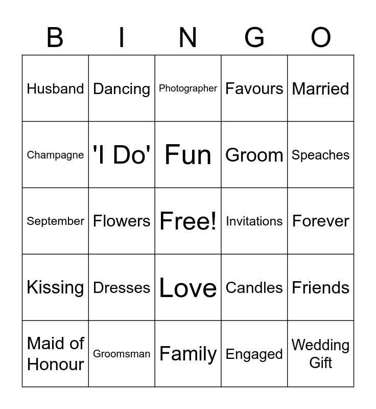 This bingo card has a free space and 54 words: Altar, Kissing, Reception, Aisle, Love, Ceremony, Favours, Wedding, Champagne, Flowers, Husband, Bridesmaid, Groomsman, Maid of Honour, Best Man, Family, Wedding Gift, Groom, Happiness, Forever, Candles, Memories, Invitations, Married, Proposal, Dancing, Speeches, Cake, South Africa, Engaged, Flower Girl, Mother-of-the-Groom, Father-of-the-Groom, Florist, Photographer, He said yes!, September, Friends, Vows, 'I Do', First Dance, DJ, Happy Tears, Suits, Dresses, Rainbow, Mr & Mr, Soul Mates, Fun, Flowers, Speaches, Thankyou, R.S.V.P and Romance.