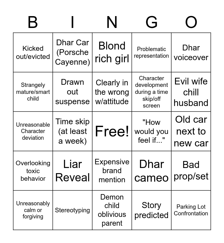 This bingo card has a free space and 49 words: Instantly Regrets it, Parking Lot Confrontation, Unfitting Music, Demon child oblivious parent, Liar Reveal, Spaghetti, Dhar Car (Porsche Cayenne), Celebrity Guest, Strangely mature/smart child, Big Payment due, Drawn out suspense, Problematic representation, Bad prop/set, Dhar cameo, So you see/you see MONOLOGUE, Cartoon Villain, Clearly in the wrong w/attitude, "How would you feel if...", "What happens in the dark always comes out in the light", Dhar voiceover, Time skip (at least a week), Story predicted, Kicked out/evicted, Character development during a time skip/off screen, begs for forgiveness, Evil wife chill husband, Unreasonably calm or forgiving, Merch in video (end card not counted), Expensive brand mention, Overlooking toxic behavior, Flashback, "Film making is my passion...", Absurdly bad acting, Emotional monologue, Stereotyping, Dhar end screen, Actually learned nothing, Unreasonably reused prop, Old car next to new car, Ipad kid, Unfitting actors, Bad green screen, On the nose names (e.g: rich), Fake crying, Unreasonable Character deviation, Blond rich girl, Sexism, Creep Behavior and PS5.