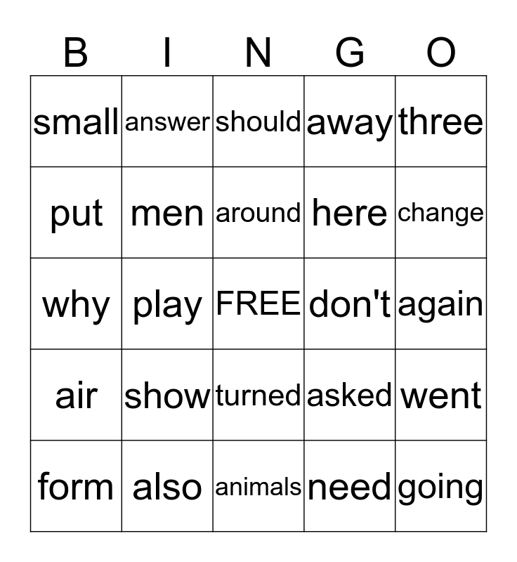 This bingo card has a free space and 24 words: show, also, around, form, three, small, put, answer, don't, turned, here, why, asked, went, men, need, again, should, change, play, going, air, away and animals.