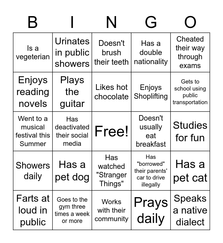 This bingo card has a free space and 24 words: Has a pet dog, Goes to the gym three times a week or more, Likes hot chocolate, Farts at loud in public, Cheated their way through exams, Is a vegeterian, Enjoys reading novels, Urinates in public showers, Doesn't usually eat breakfast, Has watched "Stranger Things", Enjoys Shoplifting, Went to a musical festival this Summer, Has "borrowed" their parents' car to drive illegally, Has a pet cat, Plays the guitar, Prays daily, Studies for fun, Doesn't brush their teeth, Gets to school using public transportation, Has deactivated their social media, Speaks a native dialect, Showers daily, Has a double nationality and Works with their community.
