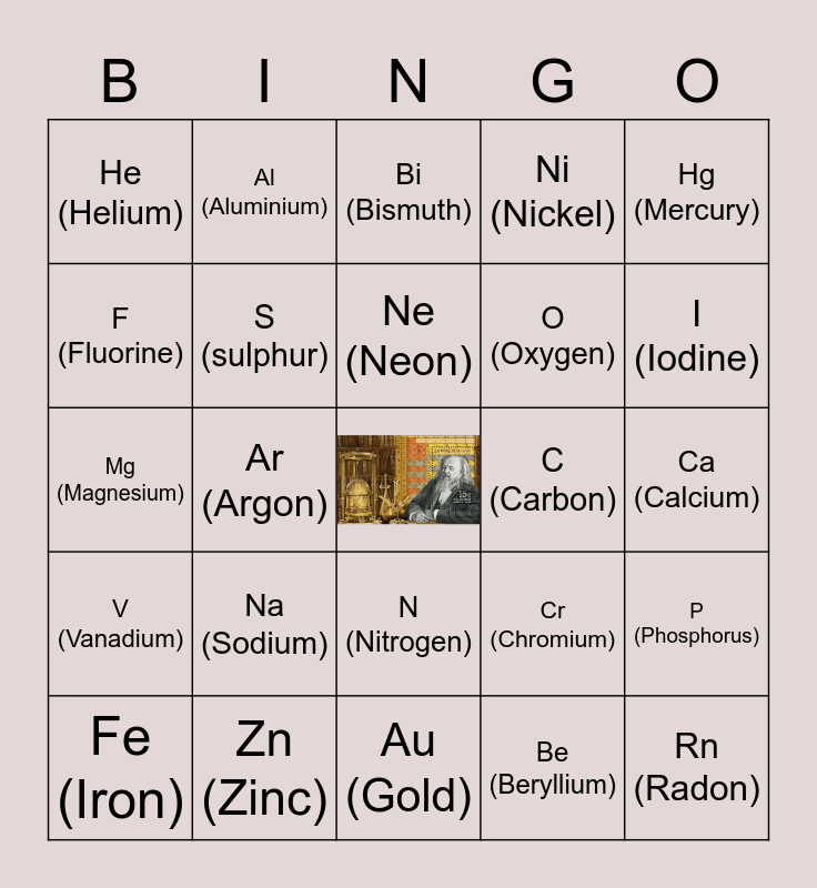 This bingo card has a free space and 24 words: Na (Sodium), Zn (Zinc), Ne (Neon), Fe (Iron), Hg (Mercury), He (Helium), F (Fluorine), Al (Aluminium), C (Carbon), N (Nitrogen), O (Oxygen), Mg (Magnesium), Cr (Chromium), P (Phosphorus), S (sulphur), Be (Beryllium), Ca (Calcium), Bi (Bismuth), I (Iodine), Ar (Argon), Rn (Radon), V (Vanadium), Ni (Nickel) and Au (Gold).
