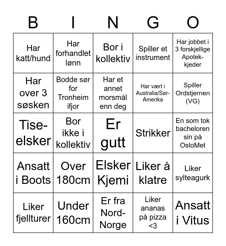 This bingo card has 55 words: Snorker, Liker fjellturer, Er jente, Har katt/hund, Er fra Nord-Norge, Er enebarn, Bodde sør for Tronheim ifjor, Er en gamer, Har vært i Australia/Sør-Amerika, Er tvilling/trilling, Spiller et instrument, Synger i dusjen, Driver med en ballsport, Liker ikke rosenkål, Har aldri badet i sjøl før i år, Har hatt Covid-19, Har jobbet i 3 forskjellige Apotek-kjeder, Bor ikke i kollektiv, Har førerkort, Er gutt, Strikker, Har båtførerbevis, Liker å klatre, Bor i kollektiv, Kan slå hjul, Har et annet morsmål enn deg, Liker ananas på pizza <3, Er fra dette fylket, En som tok bacheloren sin på OsloMet, Liker sylteagurk, Flyttet inn i helgen, En som tok bacheloren sin på UiT, En som tok bacheloren sin på Nord, Pendler til Trondheim, Har over 3 søsken, Tise-elsker, Ansatt i Apotek1, Ansatt i Boots, Ansatt i Vitus, Ansatt i Sykehus-apoteket, Har forhandlet lønn, Er medlem i Antidot, Gråt gjennom Organisk kjemi, Har brukket armen/benet, Over 180cm, Under 160cm, Må ha kaffe for å fungere, Planteelsker, Har startet en surdeig, Spiller Ordstjernen (VG), Liker BINGO, Har plass til å ha vorsj, Har ikke vært i utlandet i sommer, Elsker Kjemi and Vil bli apoteker.