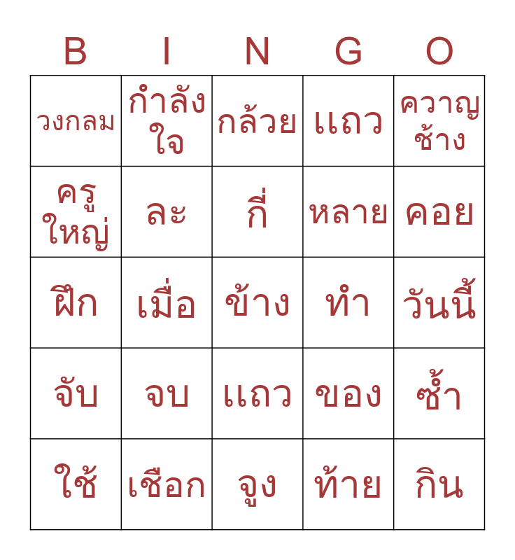This bingo card has a free space and 29 words: เเถว, เชือก, กล้วย, หมู่บ้าน, ควาญช้าง, วงกลม, ละ, กี่, ทำ, ซ้ำ, ใช้, เมื่อ, ท้าย, กิน, ฝึก, ทุก, จูง, ของ, คอย, จับ, จบ, ครั้ง, หลาย, วันนี้, ครูใหญ่, กำลังใจ, เเถว, เเถว and เเถว.