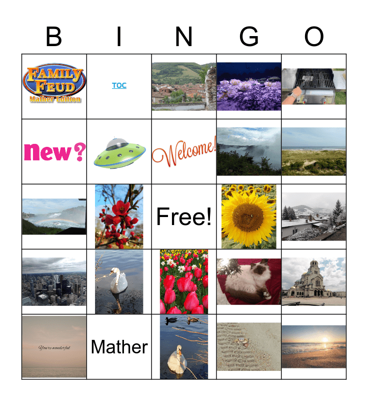 This bingo card has 23 images, a free space and 1 words: Mather.