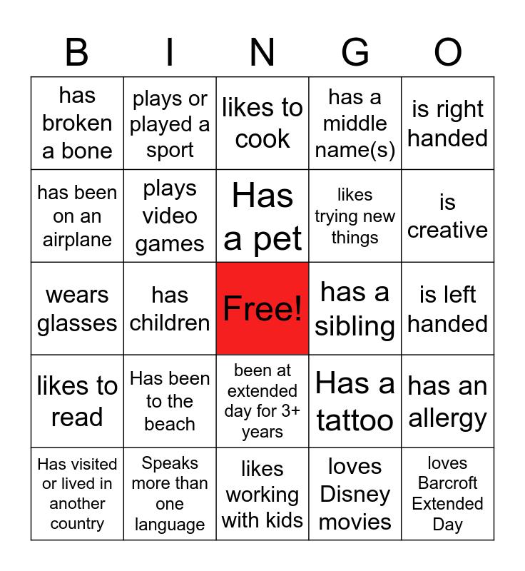 This bingo card has a free space and 24 words: Has been to the beach, Speaks more than one language, Has a pet, Has visited or lived in another country, is right handed, has broken a bone, has been on an airplane, plays or played a sport, has a sibling, been at extended day for 3+ years, likes trying new things, wears glasses, Has a tattoo, has an allergy, plays video games, loves Disney movies, is left handed, likes to cook, is creative, has children, loves Barcroft Extended Day, likes to read, has a middle name(s) and likes working with kids.