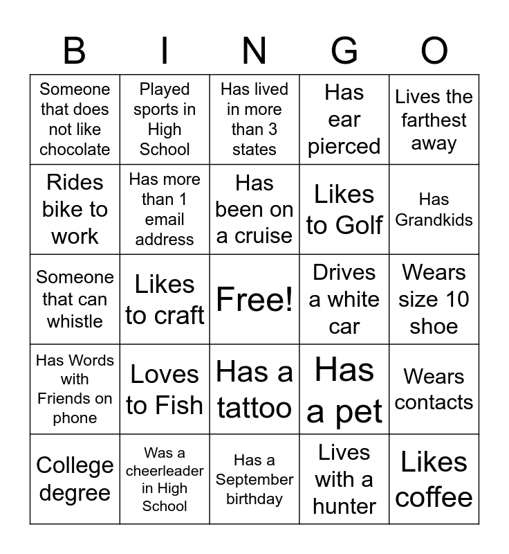 This bingo card has a free space and 24 words: Loves to Fish, Was a cheerleader in High School, Has been on a cruise, College degree, Lives the farthest away, Someone that does not like chocolate, Rides bike to work, Played sports in High School, Drives a white car, Has a tattoo, Likes to Golf, Someone that can whistle, Has a pet, Wears contacts, Has more than 1 email address, Lives with a hunter, Wears size 10 shoe, Has lived in more than 3 states, Has Grandkids, Likes to craft, Likes coffee, Has Words with Friends on phone, Has ear pierced and Has a September birthday.