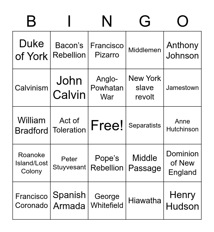 This bingo card has a free space and 114 words: Canadian Shield, Incas, Aztecs, Nation-states, Cahokia, Three sister farming, Middlemen, Caravel, Plantation, Columbian Exchange, Treaty of Tordesillas, Conquistadores, Capitalism, Encomienda, Noche triste, Mestizos, Pope’s Rebellion, Black Legend, Ferdinand and Isabella, Christopher Columbus, Francisco Coronado, Francisco Pizarro, Bartolome de Las Casas, Hernan Cortes, Protestant Reformation, Roanoke Island/Lost Colony, Spanish Armada, Primogeniture, Joint-stock company, Charter, Jamestown, Anglo-Powhatan War, Act of Toleration, Barbados slave code, Buffer state, Iroquois Confederacy, Sir Francis Drake, Sir Walter Raleigh, John Smith, Powhatan, Pocahontas, Lord De La Warr, John Rolfe, Lord Baltimore, Oliver Cromwell, James Oglethorpe, Hiawatha, Calvinism, Predestination, Conversion, Puritans, Separatists, Mayflower Compact, Massachusetts Bay Colony, Great Migration, Antinomianism, Fundamental Orders, Pequot War, King Phillip’s War, English Civil War, Dominion of New England, Navigation Laws, Glorious Revolution, Salutary neglect, Patronships, Blue laws, Martin Luther, John Calvin, William Bradford, John Winthrop, Anne Hutchinson, Roger Williams, Massasoit, Metacom (King Philip), Sir Edmond Andros, Henry Hudson, Peter Stuyvesant, Duke of York, William Penn, Indentured servants, Headright system, Bacon’s Rebellion, Royal Africa Company, Middle Passage, New York slave revolt, Stono Rebellion, Congregational Church, Jeremiad, Half-way Covenant, Salem Witch Trials, Leisler’s Rebellion, William Berkeley, Nathaniel Bacon, Anthony Johnson, Paxton Boys, Regulator movement, Triangular trade, Molasses act, Arminianism, Great Awakening, Old lights/new lights, Poor Richard’s Almanack, Zenger Trial, Royal colonies, Proprietary colonies, Jacobus Arminius, Jonathan Edwards, George Whitefield, John Trumbull, John Singleton Copley, Phillis Wheatley, Anne Hutchinson, Harvard University and City Upon a Hill.
