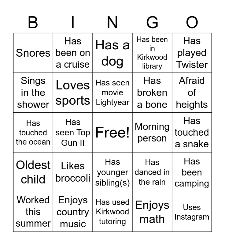 This bingo card has a free space and 24 words: Likes broccoli, Enjoys country music, Has seen movie Lightyear, Worked this summer, Has played Twister, Snores, Sings in the shower, Has been on a cruise, Morning person, Has younger sibling(s), Has broken a bone, Has touched the ocean, Has danced in the rain, Has been camping, Loves sports, Enjoys math, Has touched a snake, Has a dog, Afraid of heights, Has seen Top Gun II, Uses Instagram, Oldest child, Has been in Kirkwood library and Has used Kirkwood tutoring.