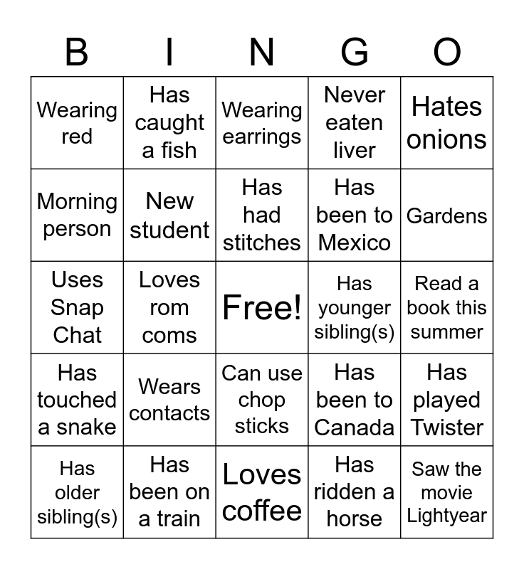 This bingo card has a free space and 24 words: Wears contacts, Has been on a train, Has had stitches, Has older sibling(s), Hates onions, Wearing red, Morning person, Has caught a fish, Has younger sibling(s), Can use chop sticks, Has been to Mexico, Uses Snap Chat, Has been to Canada, Has played Twister, New student, Has ridden a horse, Read a book this summer, Wearing earrings, Gardens, Loves rom coms, Saw the movie Lightyear, Has touched a snake, Never eaten liver and Loves coffee.