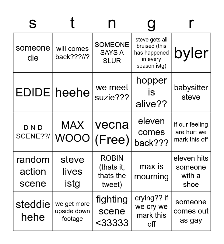 This bingo card has a free space and 24 words: steve lives istg, we get more upside down footage, we meet suzie???, steddie hehe, byler, someone die, EDIDE, will comes back???//?, eleven comes back???, ROBIN (thats it, thats the tweet), hopper is alive??, D N D SCENE??/, max is mourning, eleven hits someone with a shoe, heehe, crying?? if we cry we mark this off, if our feeling are hurt we mark this off, SOMEONE SAYS A SLUR, babysitter steve, MAX WOOO, someone comes out as gay, random action scene, steve gets all bruised (this has happened in every season istg) and fighting scene <33333.
