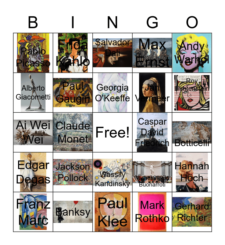This bingo card has 29 images, a free space and 29 words: Franz Marc, Gustav Klimt, Claude Monet, Rembrandt, Pablo Picasso, Salvador Dali, Paul Gaugin, Jackson Pollock, Caspar David Friedrich, Banksy, Botticelli, Gerhard Richter, Paul Klee, Mark Rothko, Roy Lichtenstein, Vincent van Gogh, Wassily Kandinsky, Edgar Degas, Andy Warhol, Ai Wei Wei, Michelangelo Buonarroti, Pippilotti Rist, Jan Vermeer, Alberto Giacometti, Max Ernst, Frida Kahlo, Hannah Höch, Georgia O'Keeffe and Niki de Saint Phalle.