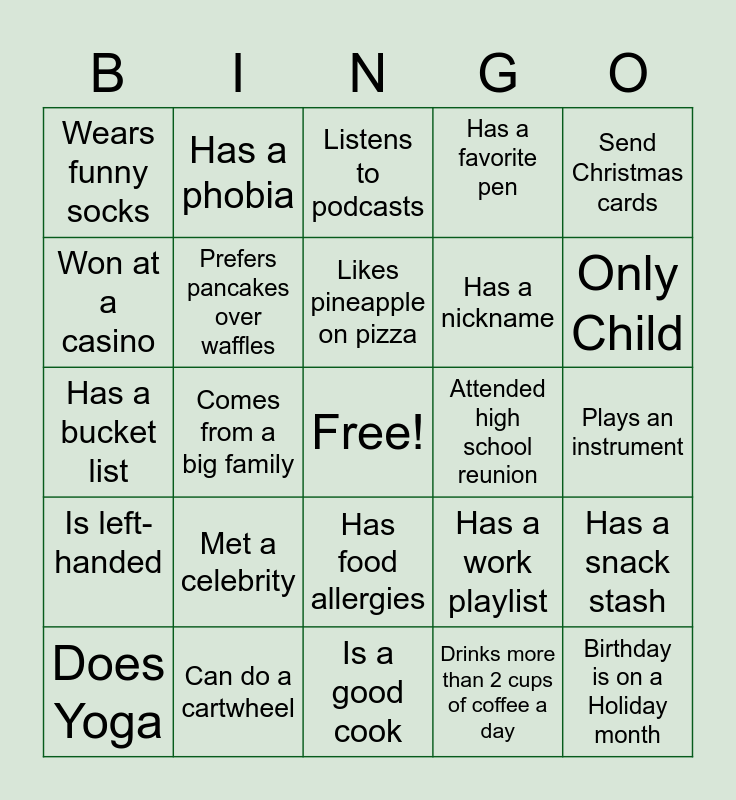 This bingo card has a free space and 24 words: Met a celebrity, Can do a cartwheel, Likes pineapple on pizza, Does Yoga, Send Christmas cards, Wears funny socks, Won at a casino, Has a phobia, Attended high school reunion, Has food allergies, Has a nickname, Has a bucket list, Has a work playlist, Has a snack stash, Prefers pancakes over waffles, Drinks more than 2 cups of coffee a day, Plays an instrument, Listens to podcasts, Only Child, Comes from a big family, Birthday is on a Holiday month, Is left-handed, Has a favorite pen and Is a good cook.